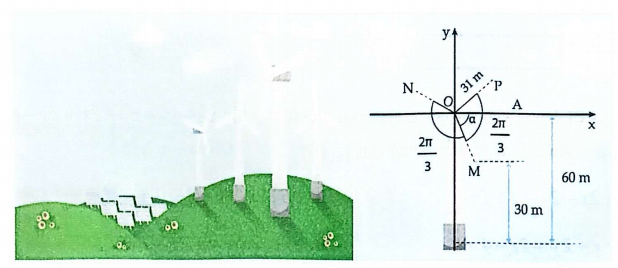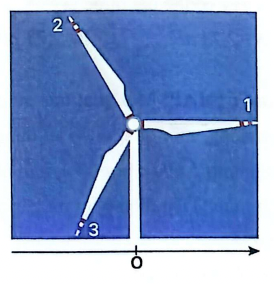 Hình bên là ảnh chụp một máy phát điện gió trên đất liền có chiều dài sải cánh là $120 \text{ m}$. Giả sử vào giữa trưa khi các tia sáng Mặt Trời vuông góc với mặt đất và cánh quạt đang quay ngược chiều kim đồng hồ với tốc độ ổn định là $20 \text{ vòng/phút}$. Chọn mốc tính thời gian lúc cánh quạt số $1$ nằm song song với mặt đất, hướng theo chiều dương của trục $Ox$. Tính tốc độ bộ phận đen (theo đơn vị $\text{m/s}$) của đầu mút cánh số $2$ trên mặt đất tại thời điểm $t=0,75 \text{ s}$ (làm tròn đến hàng đơn vị).