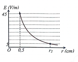 Một điện tích điểm $Q$ không đổi đặt tại điểm $O$ trong không khí. Cường độ điện trường do $Q$ gây ra có độ lớn phụ thuộc vào khoảng cách $r$ như hình vẽ. Giá trị của $r_2$ là