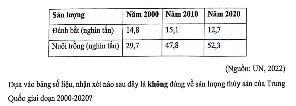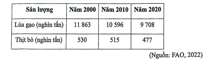 Dựa vào bảng số liệu, nhận xét nào sau đây là đúng về sản lượng lúa gạo và thịt bò của Nhật Bản giai đoạn 2000-2020?