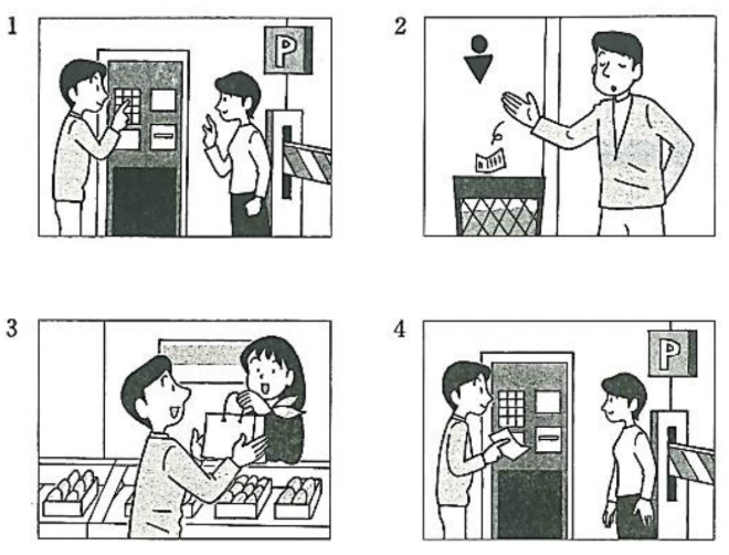 もんだい1では、はじめにしつもんを聞いてください。それからはなしをきいて、もんだいようしの1から4の中から、いちばんいいものをひとつえらんでください。
