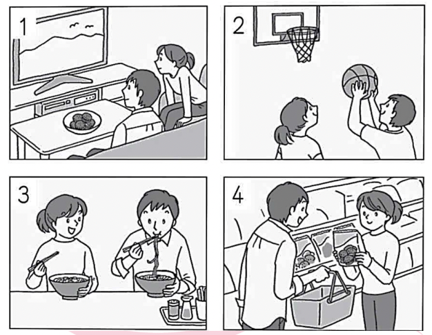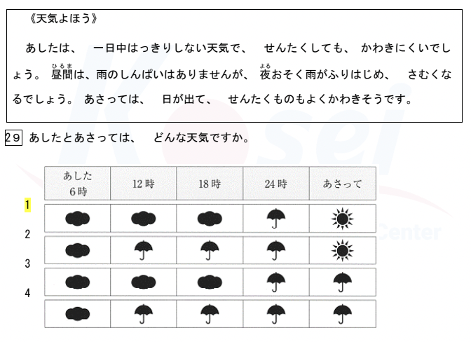 もんだい1では、はじめにしつもんを聞いてください。それからはなしをきいて、もんだいようしの1から4の中から、いちばんいいものをひとつえらんでください。